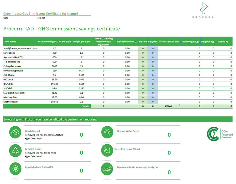 Each report details the quantity and genre of assets, along with the carbon saving associated with Procurri processing the devices; preventing the need for new equivalents to be manufactured, in preference to the devices being scrapped to landfill.